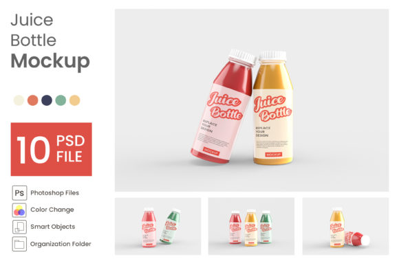 Most professional juice bottle mockups are built for Adobe Photoshop, which supports smart object layers. Some templates are also available for Figma, Canva Pro, and Adobe Illustrator depending on the file format.
