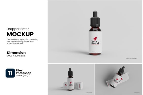 A dropper bottle mockup is a pre-built, photorealistic digital template that simulates a real glass or plastic dropper bottle. Designers place their label artwork onto the template using smart object layers, and the mockup renders the design with accurate lighting, shadows, reflections, and surface textures — producing a lifelike product image ready for immediate use across websites, social media, and marketing materials.